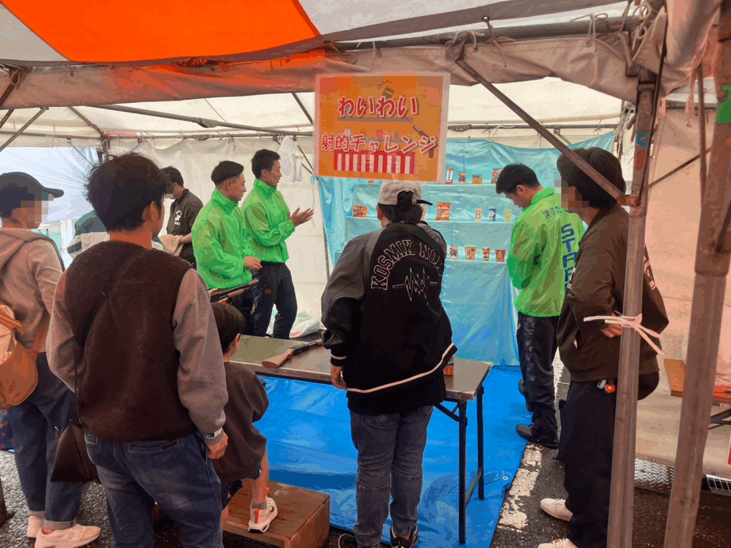 当日はあいにく小雨が降っていましたが、多くの来場者でにぎわっていました。射的ゲームの運営補助をはじめ、ステージの進行やごみ収集など、さまざまな手伝いを行いました。雨の中でも、子どもたちは楽しそうに射的をしたり、ステージを見たりしていて、その笑顔に元気をもらいました。