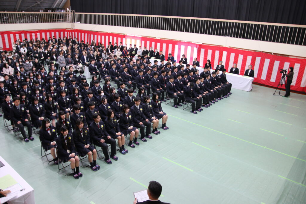 本校第1体育館で卒業式を実施しました。116名全員が元気で入場し、卒業証書を受けました。在校生代表河野明良(2年5組)の話を聞き、そして卒業生代表美浦希妃(3年5組)が挨拶しました。とても感動的な話で、将来に憧れの先生のように人を支えたいといった話をしました。式が無事で終わり、卒業生全員が退場をし、将来へ最初の一歩を踏み出しました。この先、卒業生の皆さんはそれぞれの道を歩いていき、思い通りにうまくいかないこともあるかもしれませんが、この3年間で身に着けた知識や自信で乗り越えるでしょう。